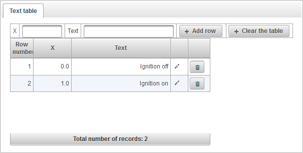An example of setting a text table to convert a device's power voltage to a text value. For example, if the voltage is less than 1V, then the text value "Ignition off" will be displayed. If the voltage is greater than 1V, the text value "Ignition on" will be displayed.
