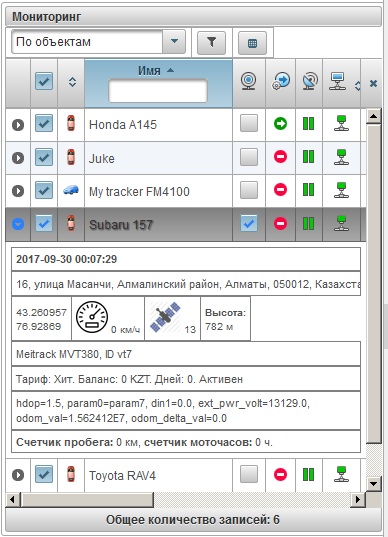 Также он появится в панели "Мониторинг". Чтобы объект отобразился в центре карты, кликните по имени объекта в списке.