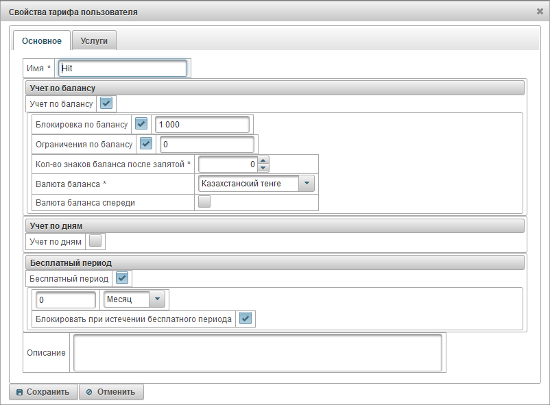 Диалоговое окно свойств тарифа пользователя состоит из следующих вкладок: