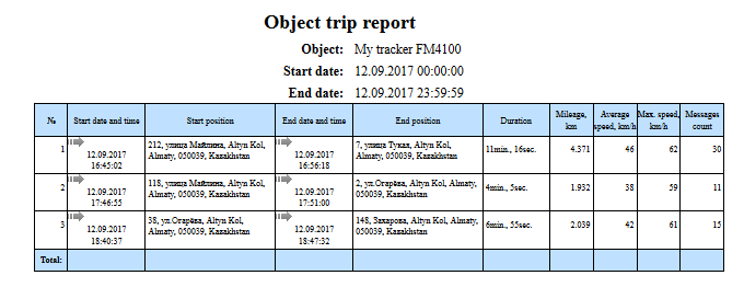 ["count": 2, "motohours": [{"finish_motohours_in_sec": 590, "message_id_list": [697737,697738,697739,697740,697741,697742,697743,697744,697745,697746,697747,697748,697749, 697750,697751,697752,697753,697754,697755], "message_cnt": 19, "wakati_from_prev_end_to_cur_beg": 0, "muda_in_sec": 590, "start_message_id": 697737, "finish_message_lon": 76.8967104, "motohours_in_sec_str": "9min. , "Kuanza_message_location": "289/1, улица Розыбакиева, Баганашыл, Almaty, Бостандыкский район, Almaty, 050023, Kazakhstan", "start_message_coordinates_str": "43.194832, 76.893901 (5)", "start_message_lon": 76.8939008, "kuanza_message_lat": 43.194832, "time_from_prev_end_to_cur_beg_str": "" finish_motohours_in_sec_str ":" 9min., 50s. "," finish_message_dt ":" 01.06.2016T10: 44: 56 "," movement_productivity ": 89.83," mileage ": 3397 , "kuanza_motohours_in_sec": 0, "start_motohours_in_sec_str": "", "duration_short_str": "9min., 50s.", "motohours_in_sec": 590, "avg_speed_in_kph": 34, "finish_message_coordinates_str" : "43.214048, 76.89671 (8)", "finish_message_location": "31, Baikadamov St, Баганашыл, Almaty, Бостандыкский район, Almaty, 050060, Kazakhstan", "obj_id": 10524, "finish_message_lat": 43.214048, "movement_time_in_sec": 530, "finish_message_id": 697755, "movement_time_in_sec_str": "8min., 50s.", "Max_speed_in_kph": 50, "idling_time_in_sec": "01.06.2016T10: 35: 06", "idling_time_in_sec_str": "1min."}, {"Finish_motohours_in_sec": 820, "message_id_list": [697929,697930,697931,697932,697933,697934,697935,697936,697937,697938], "message_cnt": 10, "time_from_prev_end_to_cur_beg": 1272 , "muda_in_sec": 230, "start_message_id": 697929, "finish_message_lon": 76.894336, "motohours_in_sec_str": "3min., 50s.", "kuanza_message_location": "217, Gagarin Ave, Баганашыл, Almaty, Бостандыкский район, Almaty, 050060, Kazakhstan "," start_message_coordinates_str ":" 43.213459, 76.897894 (8) "," start_message_lon ": 76.8978944," start_message_lat ": 43.2134592," wakati_from_prev_end _to_cur_beg_str ":" 21min., 12s. "," finish_motohours_in_sec_str ":" 13min., 40s. "," finish_message_dt ":" 01.06.2016T11: 09: 58 "," movement_productivity ": 100," mileage ": 1834," kuanza_motohours_in_sec ": 590," start_motohours_in_sec_str ":" 9min., 50s. "," duration_short_str ":" 3min., 50s. "," motohours_in_sec ": 36," finish_message_coordinates_str ":" 43.200099, 76.894336 ( 8) "," kumaliza_message_location ":" Кожабекова, Kozhabekov St, Баганашыл, Almaty, Бостандыкский район, Almaty, 050023, Kazakhstan "," obj_id ": 10524," finish_message_lat ": 43.2000992," movement_time_in_sec ": 230," finish_message_id ": 697938, "movement_time_in_sec_str": "3min., 50s.", "Max_speed_in_kph": 43, "idling_time_in_sec": "01.06.2016T11: 06: 08", "idling_time_in_sec_str": ""}}}