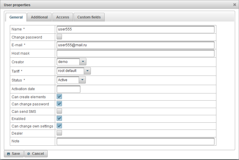Mazungumzo ya kuunda kitu kipya hufungua. Katika shamba la "Jina", ingiza jina la kitu, katika uwanja wa "Mfano wa Kifaa", chagua mtindo wa kifaa kutoka kwenye orodha, katika "Sifa ya Kitambulisho cha kipekee" ingiza kitambulisho cha kipekee (IMEI au namba ya serial) ya kitu , katika "Nambari ya simu" shamba uingize namba ya simu ya SIM kadi, imeingizwa kwenye kifaa. Baada ya kuchagua mfano wa kifaa, kifungo